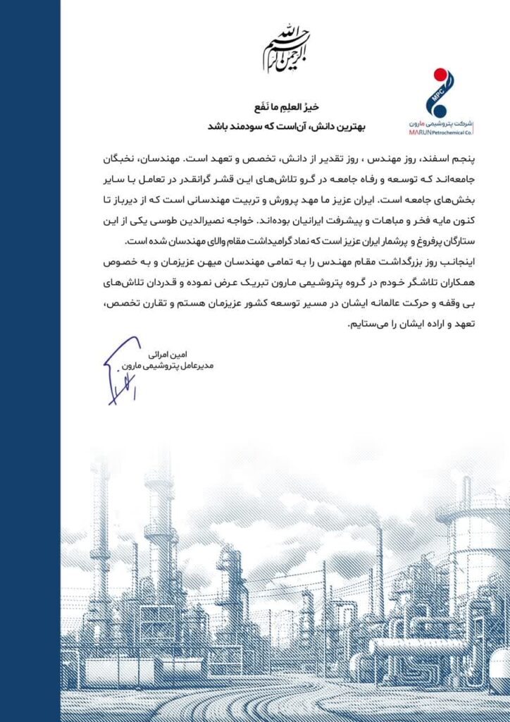 اینجانب روز بزرگداشت مقام مهندس را به تمامی مهندسان میهن عزیزمان و به خصوص همکاران تلاشگر خودم در گروه پتروشیمی مارون تبریک عرض نموده و قدردان تلاشهای بی وقفه و حرکت عالمانه ایشان در مسیر توسعه کشور عزیزمان هستم و تقارن تخصص، تعهد و اراده ایشان را میستایم.