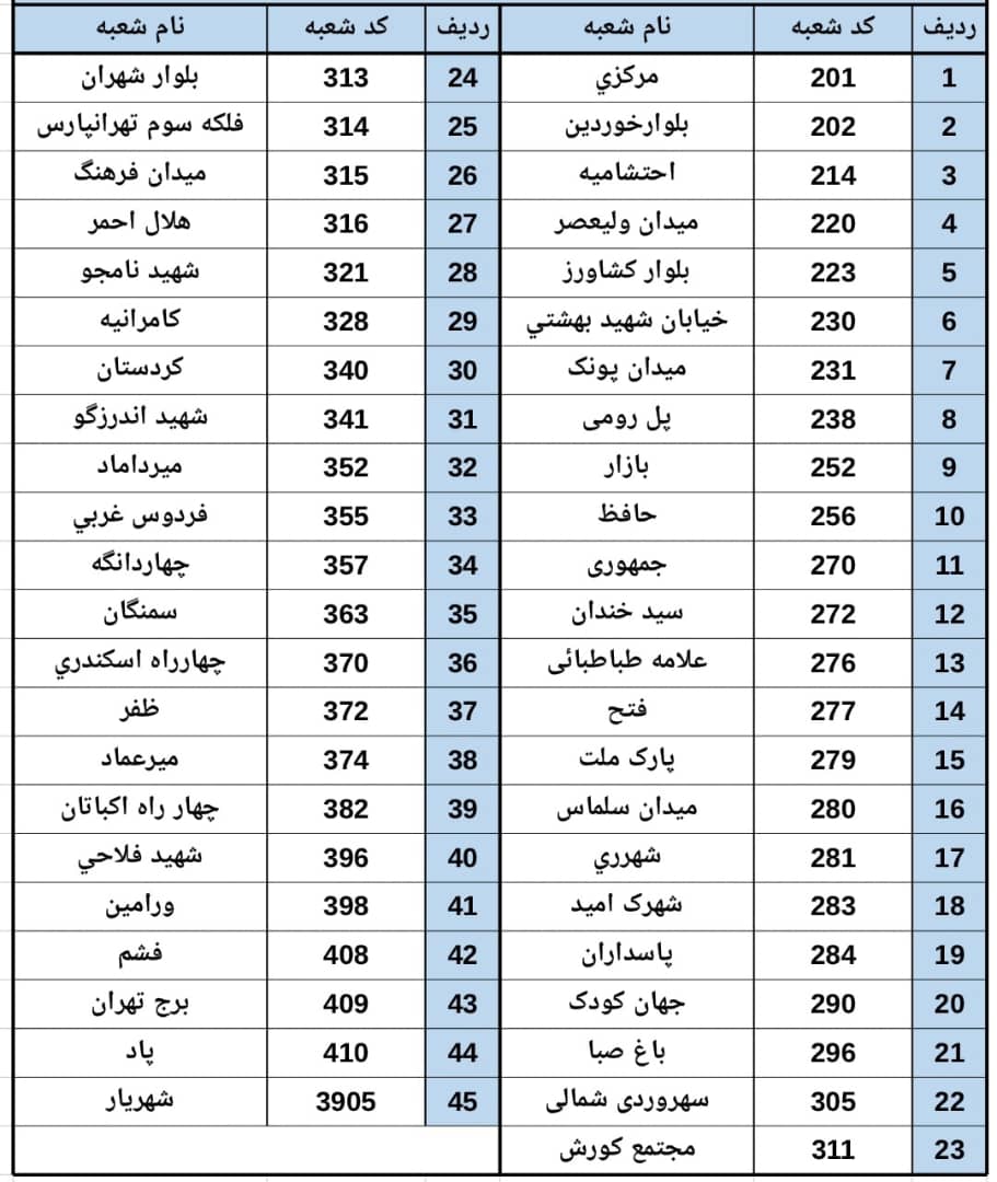 به اطلاع مشتریان گرامی میرساند، با توجه به تداوم برودت هوا و بر اساس اعلام استانداری محترم تهران، ابلاغیه کانون بانکها و مؤسسات اعتباری خصوصی، واحدهای ستادی و شعبههای استان تهران در روز سهشنبه مورخ ۷ اسفندماه تعطیل میباشد، شایان ذکر است ارائه خدمت به مشتریان گرامی در روز یاد شده توسط شعبههای کشیک مطابق با فهرست به شرح زیر از ساعت ۸:۰۰ تا ۱۲:۰۰ انجام خواهد شد.