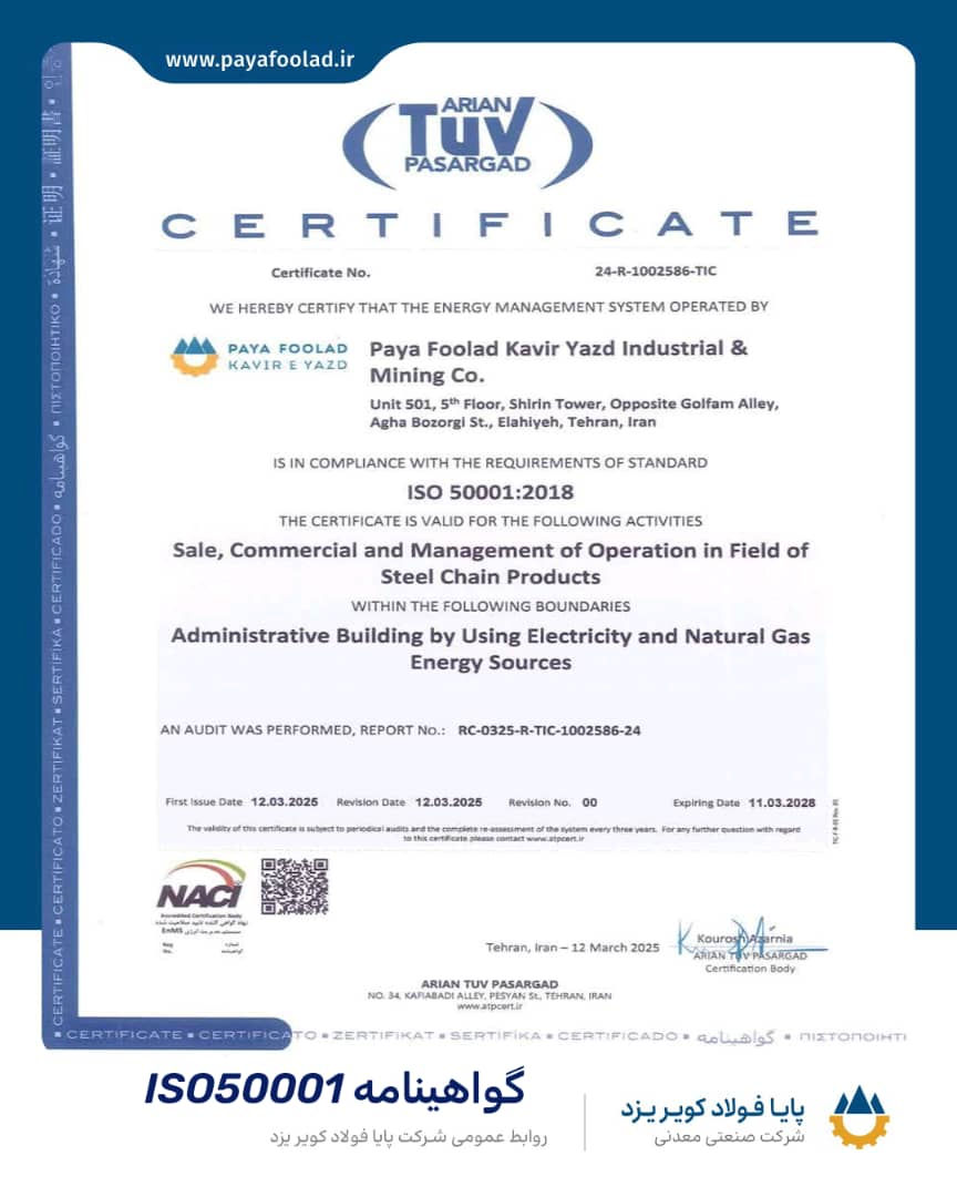 به گزارش از روابط عمومی شرکت پایا فولاد کویر یزد ،این گواهینامه یک استاندارد بین المللی جدید برای یک سیستم مدیریت انرژی (EnMS) است. این استاندارد چارچوبی را برای ایجاد مدیریت انرژی برای سازمانهایی که می خواهند بهره وری انرژی خود را بصورت منطقی بهبود دهند فراهم می کند. ISO 50001 در هماهنگی با سایر استانداردها مانند کیفیت، ایمنی و سلامتی، مدیریت زیست محیطی تدوین شده است.