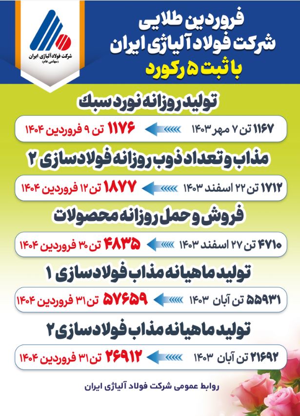 به گزارش از روابطعمومی فولاژ، در فروردین ۱۴۰۴، شرکت فولاد آلیاژی ایران موفق به ثبت پنج رکورد جدید در حوزههای مختلف تولید و فروش شد که نشاندهنده عملکرد درخشان و چشمانداز روشن این شرکت در سال جاری است.