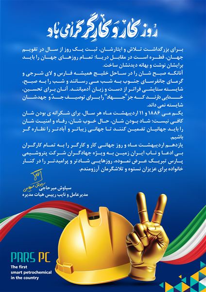 یازدهم اردیبهشت ماه و روز جهانی کار و کارگر را به تمام کارگران بی ادعا و ناب ایران زمین به ویژه جهادگران شرکت پتروشیمی پارس تبریک عرض نموده ، روزهایی شادتر و پرامیدتر را در کنار خانواده برای عزیزان نستوه و تلاشگرمان آرزومندم.