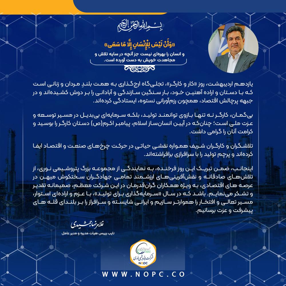 پیام دکتر غلامرضا جمشیدی، مدیر عامل به مناسبت گرامیداشت روز جهانی کار و کارگر