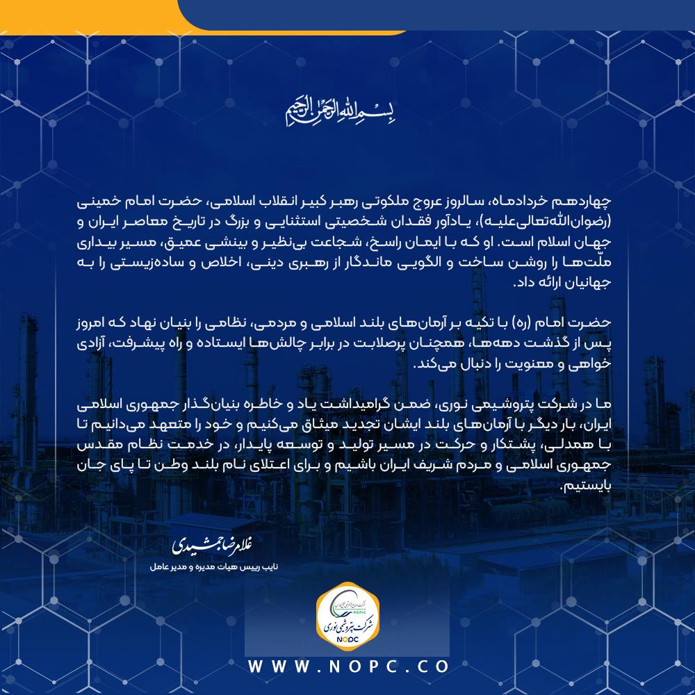 پیام دکترغلامرضا جمشیدی، مدیر عامل به مناسبت سالروز ارتحال ملکوتی بنیانگذار کبیر انقلاب اسلامی، امام خمینی (ره)