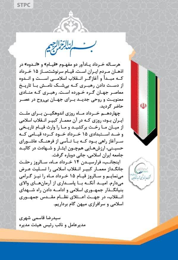 مهندس سیدرضا قاسمی شهری به مناسبت فرارسیدن ۱۴ و ۱۵ خرداد در پیامی نوشت: «امید آنکه با پاسداری از آرمانهای والای بنیانگذار جمهوری اسلامی در جهت اعتلای نظام مقدس جمهوری اسلامی و سرافرازی میهن گام برداریم»