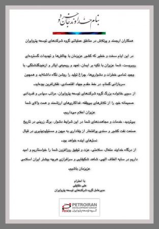 پیام تقدیر و تشكر مدیرعامل گروه توسعه پتروایران از كاركنان خدوم این شركت