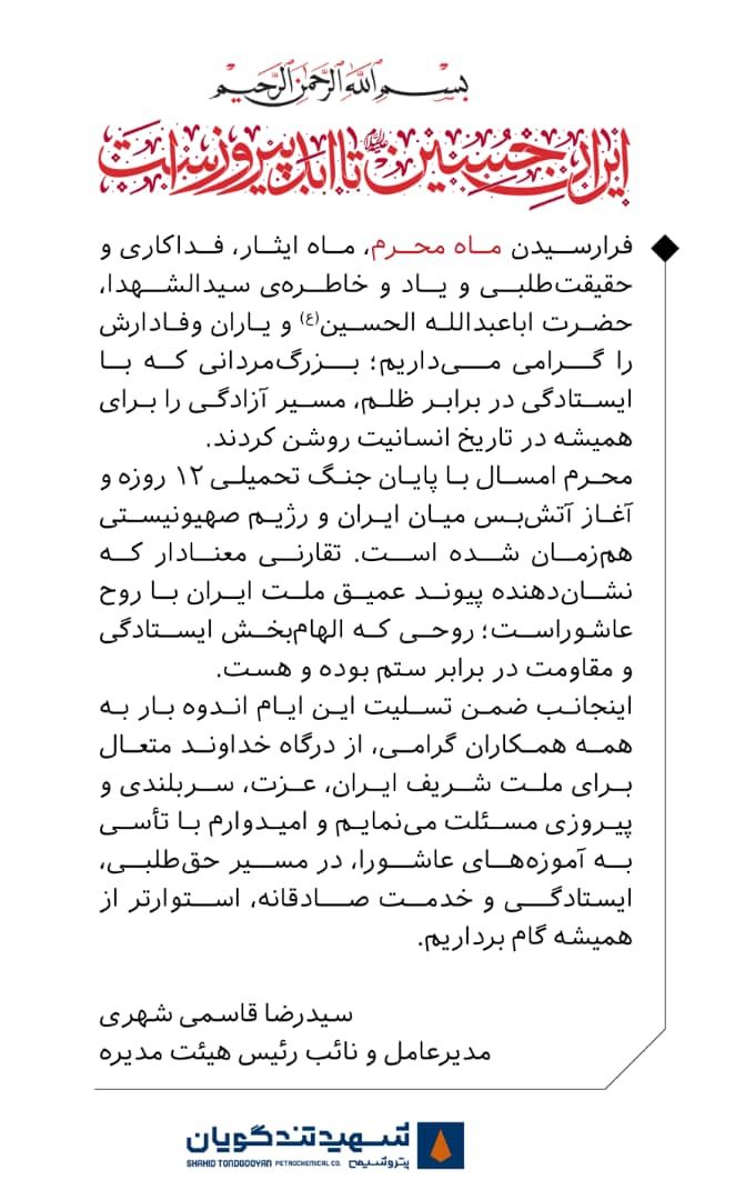 » سیدرضا قاسمی شهری در پیامی فرارسیدن ماه محرم و شهادت سید و سالار شهیدان را تسلیت گفت