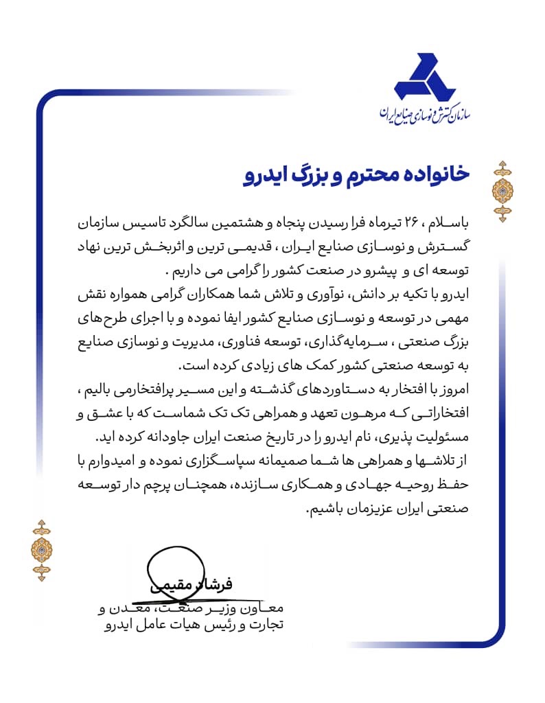 معاون وزیر صمت و رئیس هیئت عامل ایدرو در پیامی پنجاه و هشتمین سالگرد تاسیس ایدرو را تبریک گفت
