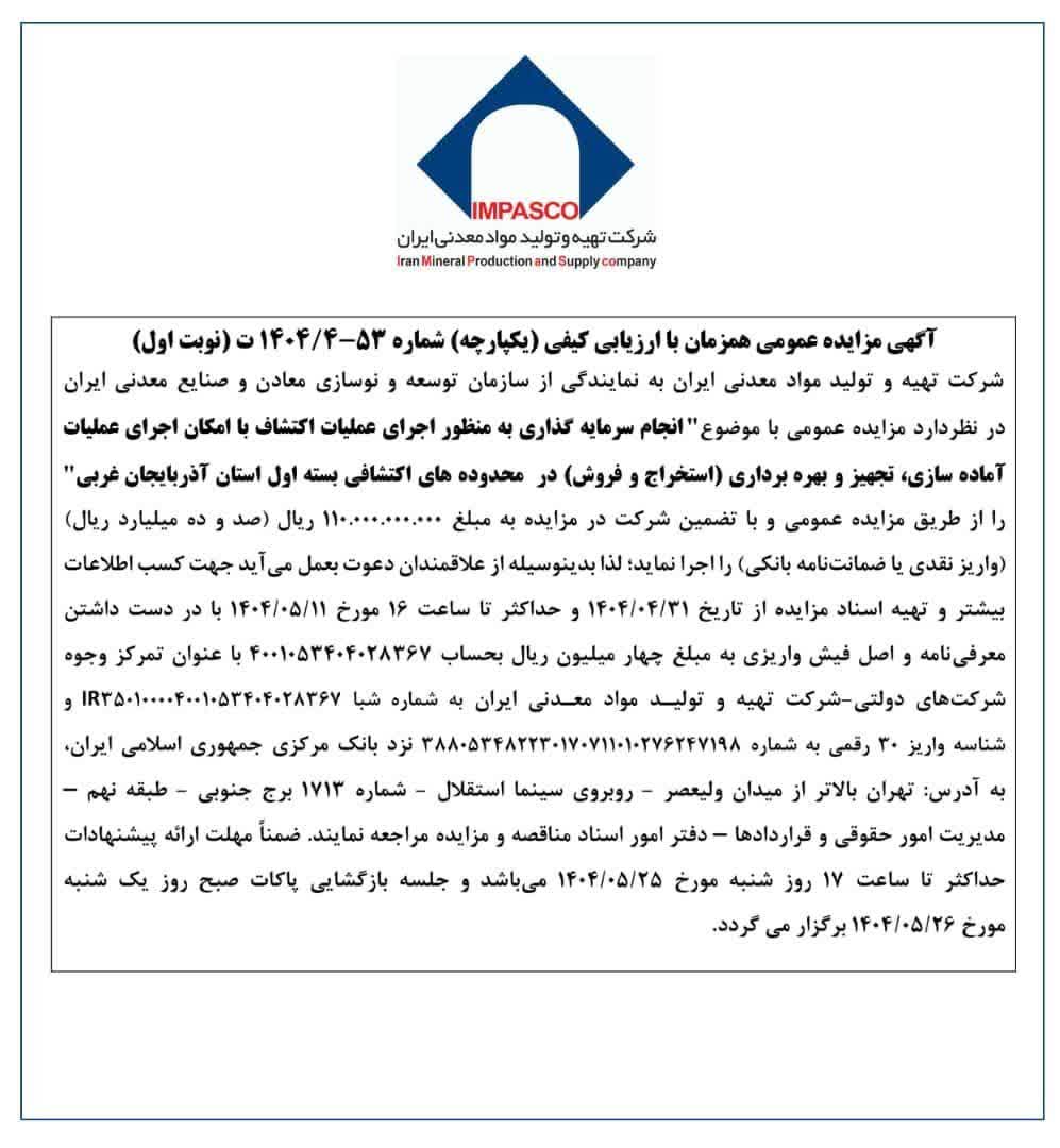 شرکت تهیه و تولید مواد معدنی ایران به نمایندگی از سازمان توسعه و نوسازی معادن و صنایع معدنی ایران در نظردارد مزایده عمومی با موضوع“انجام سرمایه گذاری به منظور اجرای عملیات اکتشاف با امکان اجرای عملیات آماده سازی، تجهیز و بهره برداری (استخراج و فروش) در محدوده های اکتشافی بسته اول استان آذربایجان غربی” را از طریق مزایده عمومی و با تضمین شرکت در مزایده به مبلغ ۱۱۰٫۰۰۰٫۰۰۰٫۰۰۰ ریال (صد و ده میلیارد ریال) (واریز نقدی یا ضمانتنامه بانکی) را اجرا نماید؛ لذا بدینوسیله از علاقمندان دعوت بعمل میآید جهت کسب اطلاعات بیشتر و تهیه اسناد مزایده از تاریخ ۱۴۰۴/۰۴/۳۱ و حداکثر تا ساعت ۱۶ مورخ ۱۴۰۴/۰۵/۱۱ با در دست داشتن معرفینامه و اصل فیش واریزی به مبلغ چهار میلیون ریال بحساب ۴۰۰۱۰۵۳۴۰۴۰۲۸۳۶۷ با عنوان تمرکز وجوه شرکتهای دولتی-شرکت تهیه و تولیـد مواد معـدنی ایران به شماره شبا ۳۵۰۱۰۰۰۰۴۰۰۱۰۵۳۴۰۴۰۲۸۳۶۷IR و شناسه واریز ۳۰ رقمی به شماره ۳۸۸۰۵۳۴۸۲۲۳۰۱۷۰۷۱۱۰۱۰۲۷۶۲۴۷۱۹۸ نزد بانک مرکزی جمهوری اسلامی ایران، به آدرس: تهران بالاتر از میدان ولیعصر – روبروی سینما استقلال – شماره ۱۷۱۳ برج جنوبی – طبقه نهم – مدیریت امور حقوقی و قراردادها – دفتر امور اسناد مناقصه و مزایده مراجعه نمایند. ضمناً مهلت ارائه پیشنهادات حداکثر تا ساعت ۱۷ روز شنبه مورخ ۱۴۰۴/۰۵/۲۵ میباشد و جلسه بازگشایی پاکات صبح روز یک شنبه مورخ ۱۴۰۴/۰۵/۲۶ برگزار می گردد.