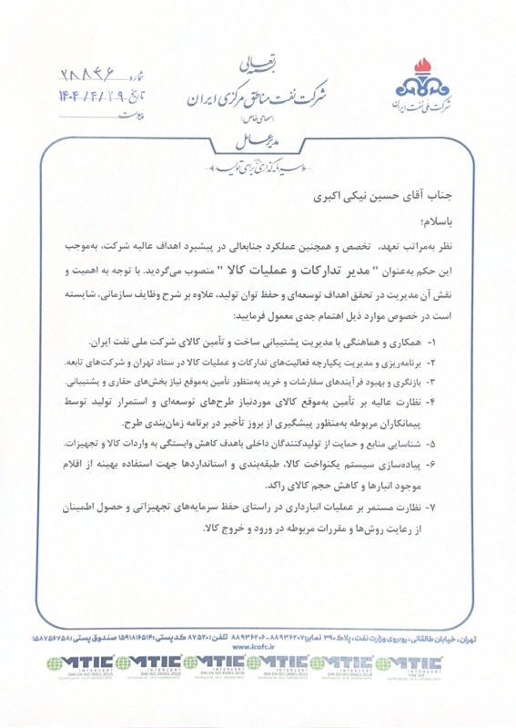 به گزارش پایگاه اطلاع رسانی نفت مناطق مرکزی ایران؛ پیمان ایمانی همچنین در حکمی جداگانه از تلاش ها، همکاری و زحمات میثم عزیزی در زمان تصدی این مدیریت تشکر و قدردانی کرد.