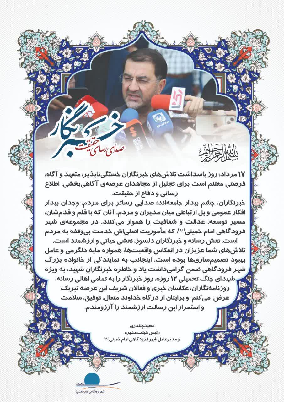پیام سعید چلندری، رئیس هیئتمدیره و مدیرعامل شهر فرودگاهی امام خمینی(ره)، بهمناسبت روز خبرنگار