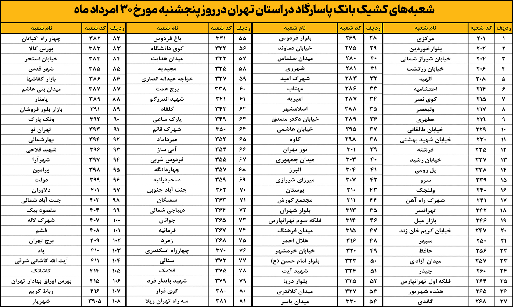 بر این اساس، شعبههای منتخب بانک پاسارگاد در استان تهران در روز پنجشنبه۳۰ امردادماه۱۴۰۴، طبق فهرست زیر، از ساعت ۷:۰۰ تا ۱۲:۳۰ آماده ارائه خدمات به مشتریان ارجمند خواهند بود.