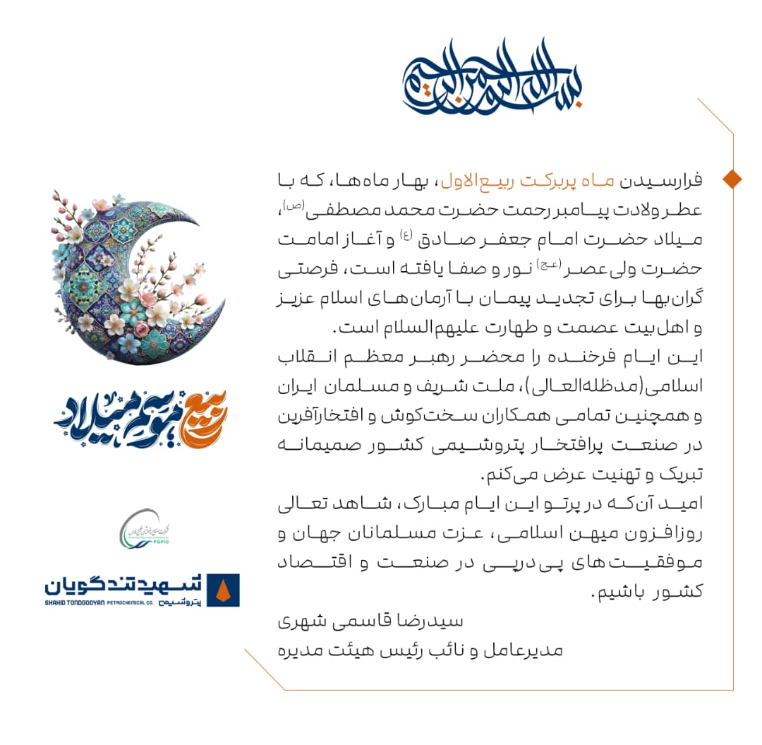 پیام تبریک مدیرعامل پتروشیمی شهید تندگویان بهمناسبت فرارسیدن ماه پر برکت ربیع الاول