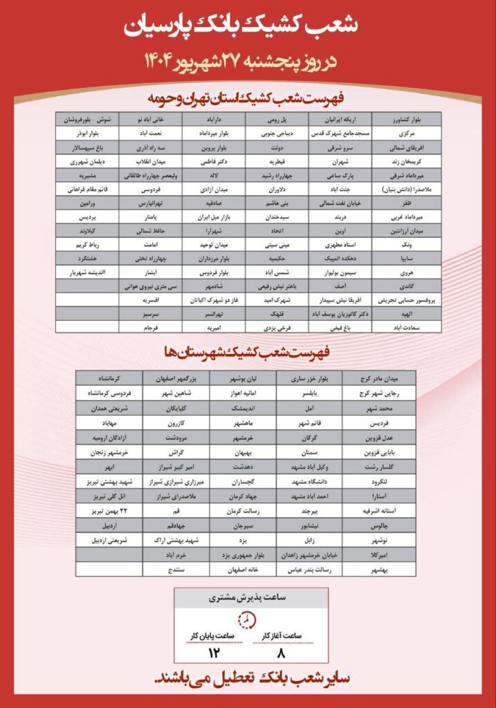 فهرست شعب کشیک بانک پارسیان در روز پنجشنبه مورخ ۲۷ شهریورماه.