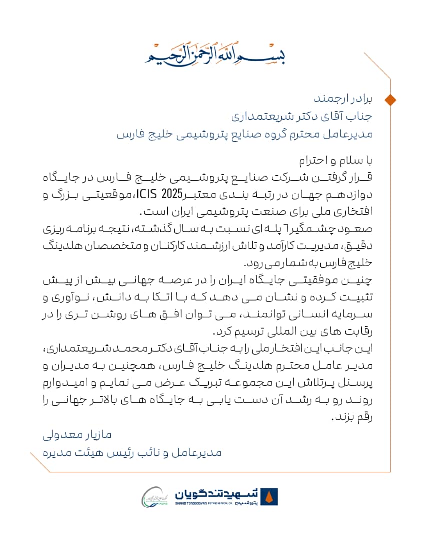 پیام مهندس معدولی مدیرعامل پتروشیمی شهید تندگویان به مناسبت درخشش صنعت پتروشیمی ایران در عرصه جهانی با جهش ۶ پلهای
