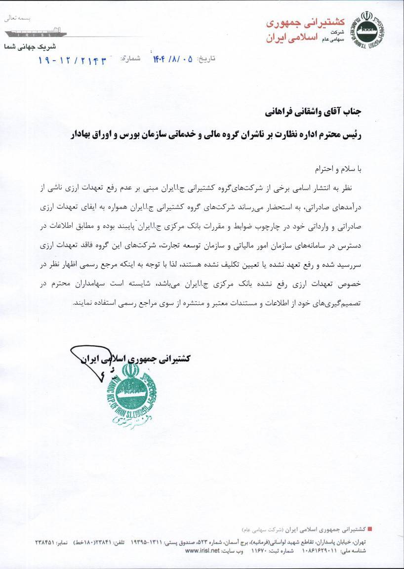 به گزارش از مانا، با توجه به انتشار اسامی برخی از شرکت های گروه کشتیرانی جمهوری اسلامی ایران مبنی بر عدم رفع تعهدات ارزی ناشی از درآمدهای صادرات این گروه؛ گروه کشتیرانی جمهوری اسلامی ایران اعلام میکند که شرکتهای این گروه همواره به ایفای تعهدات ارزی صادراتی و وارداتی خود در چارچوب ضوابط و مقررات بانک مرکزی پایبند بوده و مطابق اطلاعات در دسترس در سامانههای سازمان امور مالیاتی و سازمان توسعه تجارت، شرکتهای این گروه فاقد تعهدات ارزی سررسید شده و رفع تعهد نشده یا تعیین تکلیف نشده هستند.
