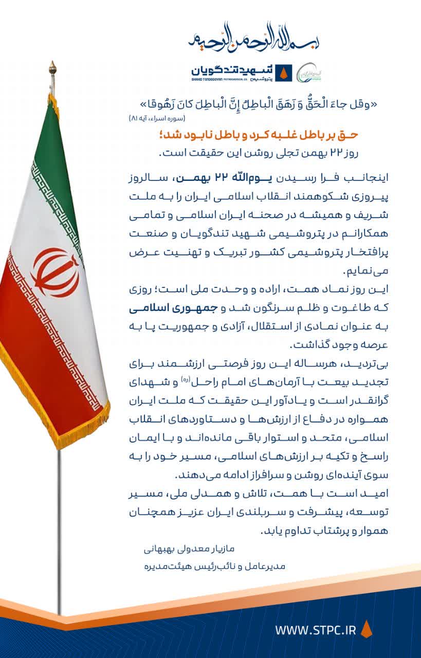 » پیام تبریک مدیرعامل پتروشیمی شهید تندگویان به مناسبت ۲۲ بهمن و پیروزی شکوهمند انقلاب اسلامی