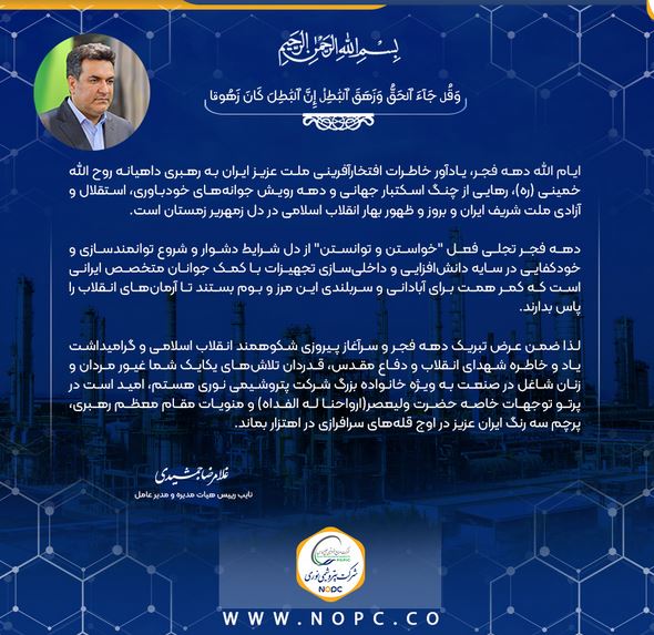 پیام دکتر جمشیدی، مدیر عامل شرکت پتروشیمی نوری به مناسبت فرا رسیدن دهه فجر انقلاب اسلامی