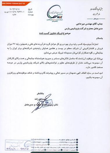 » پیام تبریک مدیر عامل شرکت مبین انرژی به مدیریت و کارکنان پتروشیمی پارس