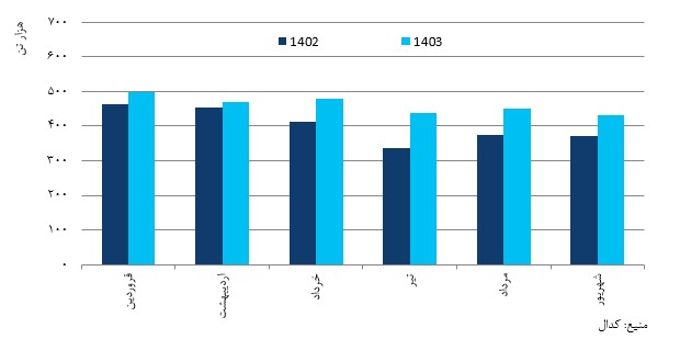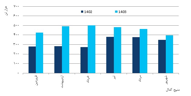 نمودار ۲. عملکرد شش ماهه فروش گندله در شرکت فولاد سنگان در سالهای ۱۴۰۲ و ۱۴۰۳